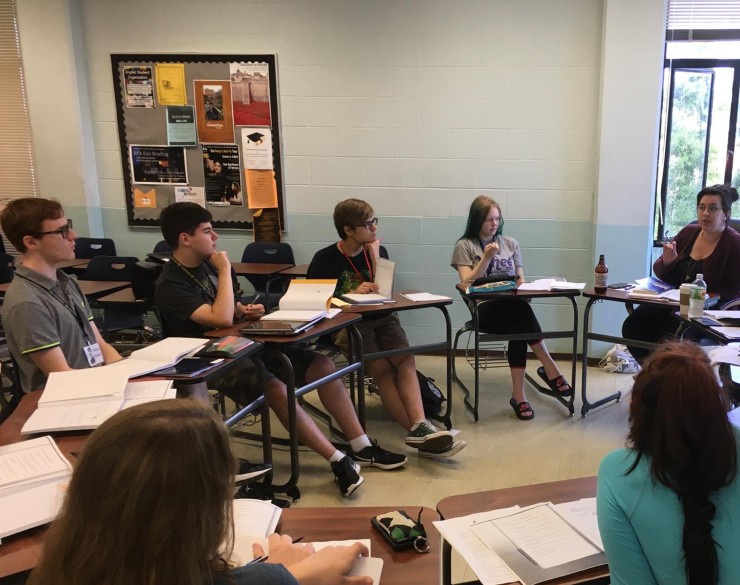 PAWW campers sitting with notebooks and pencils at desks arranged in a circle, attentatively listening to their instructor