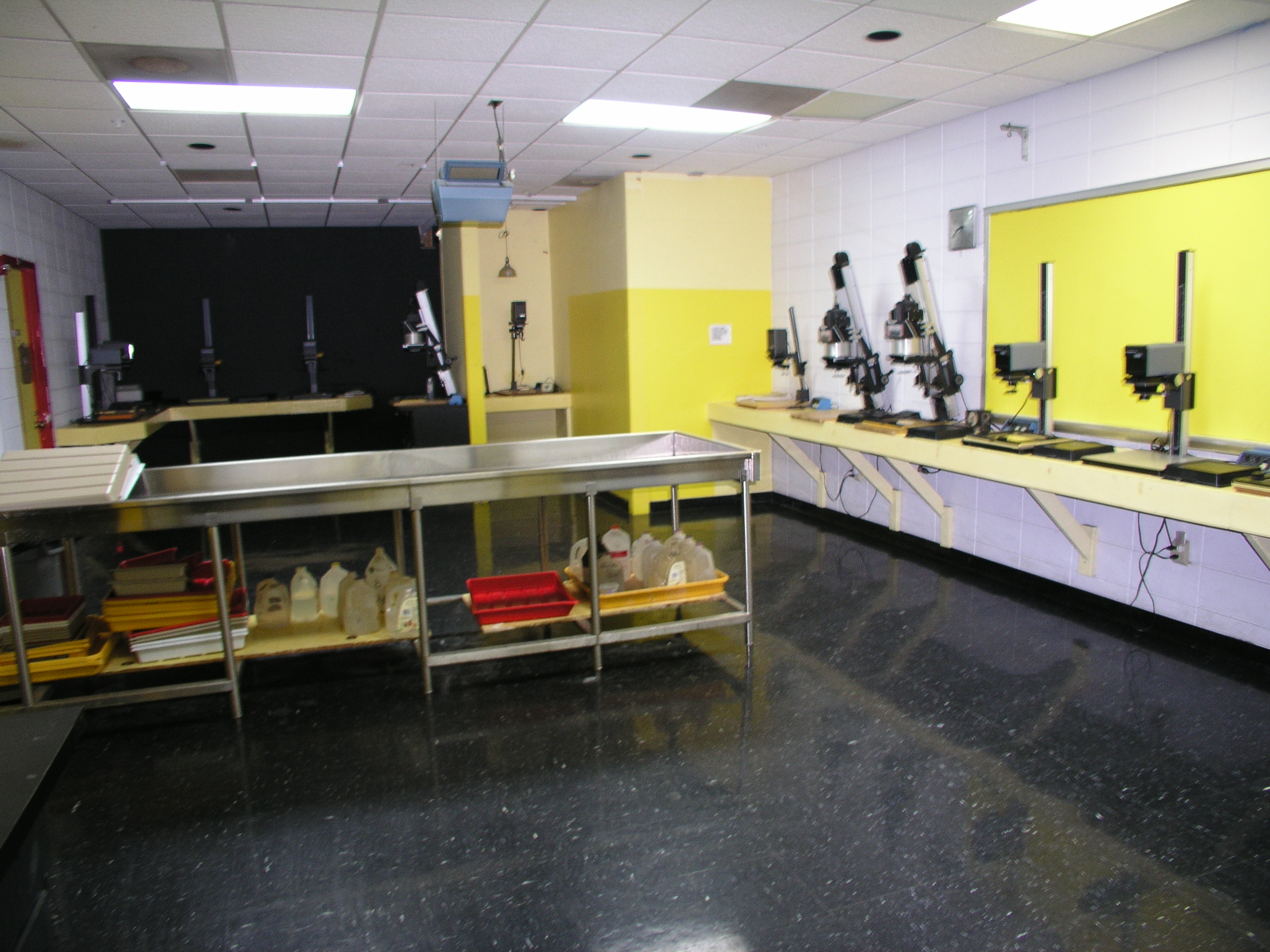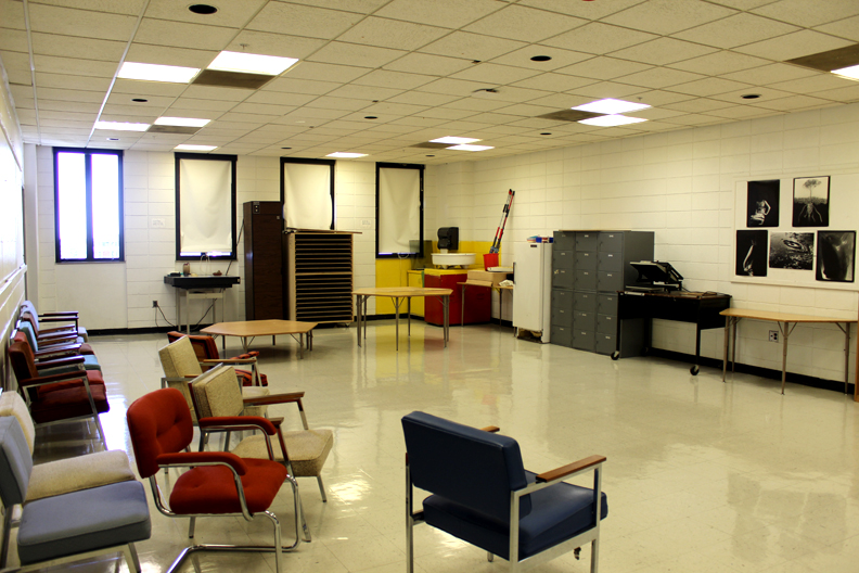 The traditional film darkroom area has 2,846 square feet of studio space, with 24 hour access, including seminar space, a basic hot-light studio setup, a gang darkroom with fourteen enlargers, and six individual darkroom spaces for students with an emphasis in photography.