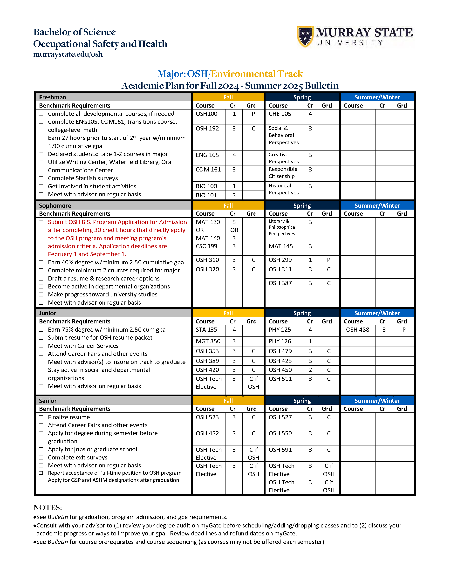 - Earn a C or better in all OSH classes;
