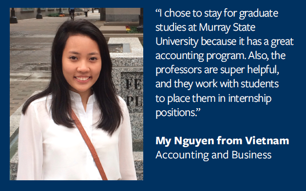 Murray State tự hào mang đến cho sinh viên quốc tế một môi trường sống an toàn và thân thiện. Năm 2012, thành phố Murray được bầu chọn là một trong 5 thành phố nhỏ thân thiện nhất nước Mỹ bởi tạp chí USA Today. Với hơn 150 đội nhóm thể thao và các câu lạc bộ, sinh viên quốc tế có cơ hội trải nghiệm cuộc sống Mỹ và phát huy năng lực bản thân thông qua các sự kiện văn hoá, thể thao trong và ngoài trường. Tự hào với lịch sử phát triển lâu đời, Đại học Murray State sẽ tiếp tục phát huy, làm giàu các giá trị truyền thống, đem đến những trải nghiệm tuyệt vời cho sinh viên quốc tế.