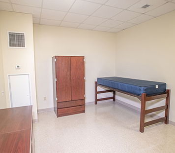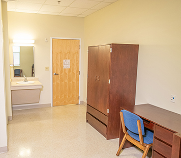 Bedroom Movable furniture- Desk: 42”w x 24”d x 30”h, Wardrobe: 37”w x 24”d x 72”h (includes hanger bar and 2 drawers.), and Chest of 3 drawers: 36" w x 24"d x 30"h. Mattress (80") and bed frame (can adjust height by resident).