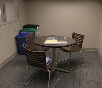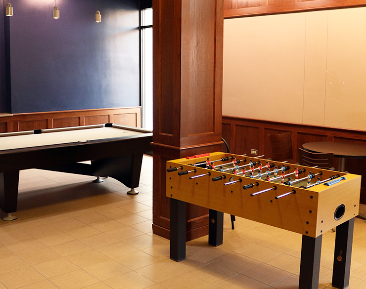 Located on the 1st floor and contains a foosball table, pool table, and a drop down projector screen. Equipment can be checked out at the front desk.