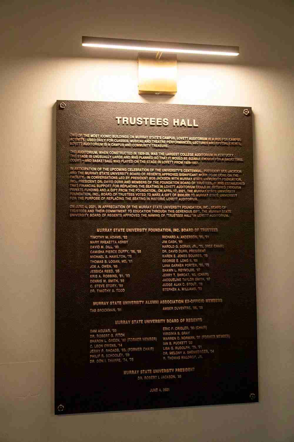 On June 4, 2021, upon the recommendation of Murray State President Dr. Bob Jackson, the University’s Board of Regents approved a $12.3 million bond project to help fund several asset preservation projects on campus, including Lovett Auditorium. The Board also voted to accept a gift of $500,000 from the Murray State University Foundation, Inc. for the funding of the new seating; thus naming the main hall, Trustees Hall, in honor of the current Murray State Foundation Board of Trustees. As part of the re-opening event, a special plaque was unveiled to commemorate Trustees Hall.