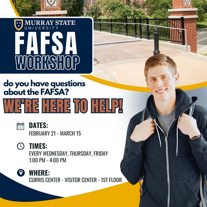 Murray State University is hosting Free Application for Federal Student Aid (FAFSA) workshops for students every Wednesday, Thursday and Friday from 1-4 p.m. through March 15 in the new visitor center, located on the first floor of the Curris Center. Students are encouraged to attend an upcoming workshop, as the 2024-2025 FAFSA is now open at studentaid.gov.
