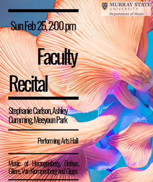 There will be a faculty recital on Feb. 25 at 2 p.m. in the Performing Arts Hall in Old Fine Arts, with Dr. Ashley Cumming on horn and Dr. Stephanie Carlson on oboe. They will be assisted by Dr. Meeyoun Park on piano. Music will be from Herzogenberg, Defaye, Gliere, Van Klompenberg and Gipps.