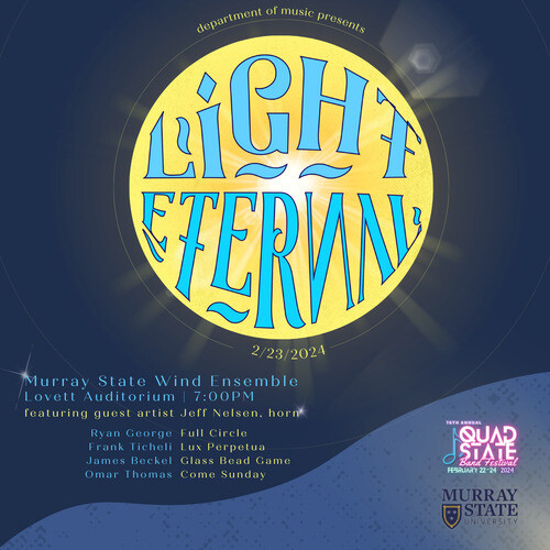 The Department of Music presents “Light Eternal,” the Murray State Wind Ensemble, featuring guest artist and Professor of Horn at Indiana University Jeff Nelson, alongside Ryan George of Full Circle, Frank Ticheli of Lux Perpetua, James Beckel of Glass Bead Game and Omar Thomas of Come Sunday. The event is part of the Quad State High School Honor Band festivities and will take place on Feb. 23 at 7 p.m. in Lovett Auditorium.