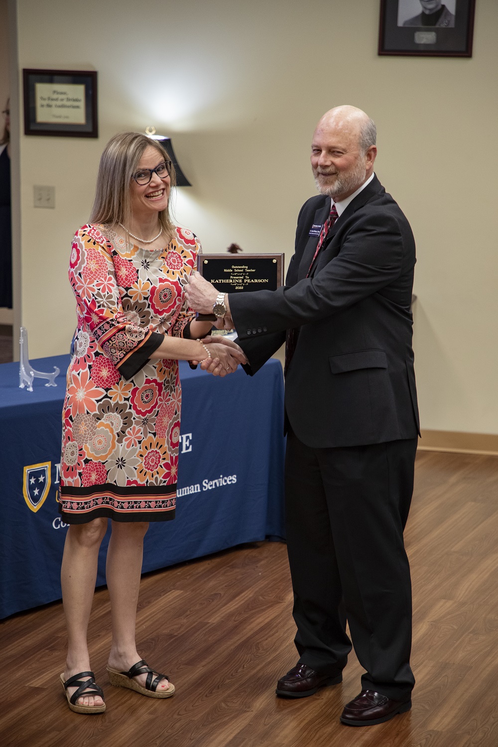 Dr. Susana Bloomdahl, assistant dean of the College of Education and Human Services, announced the following awards as Dr. David Whaley, dean of the College of Education and Human Services, presented the awardees their plaques: