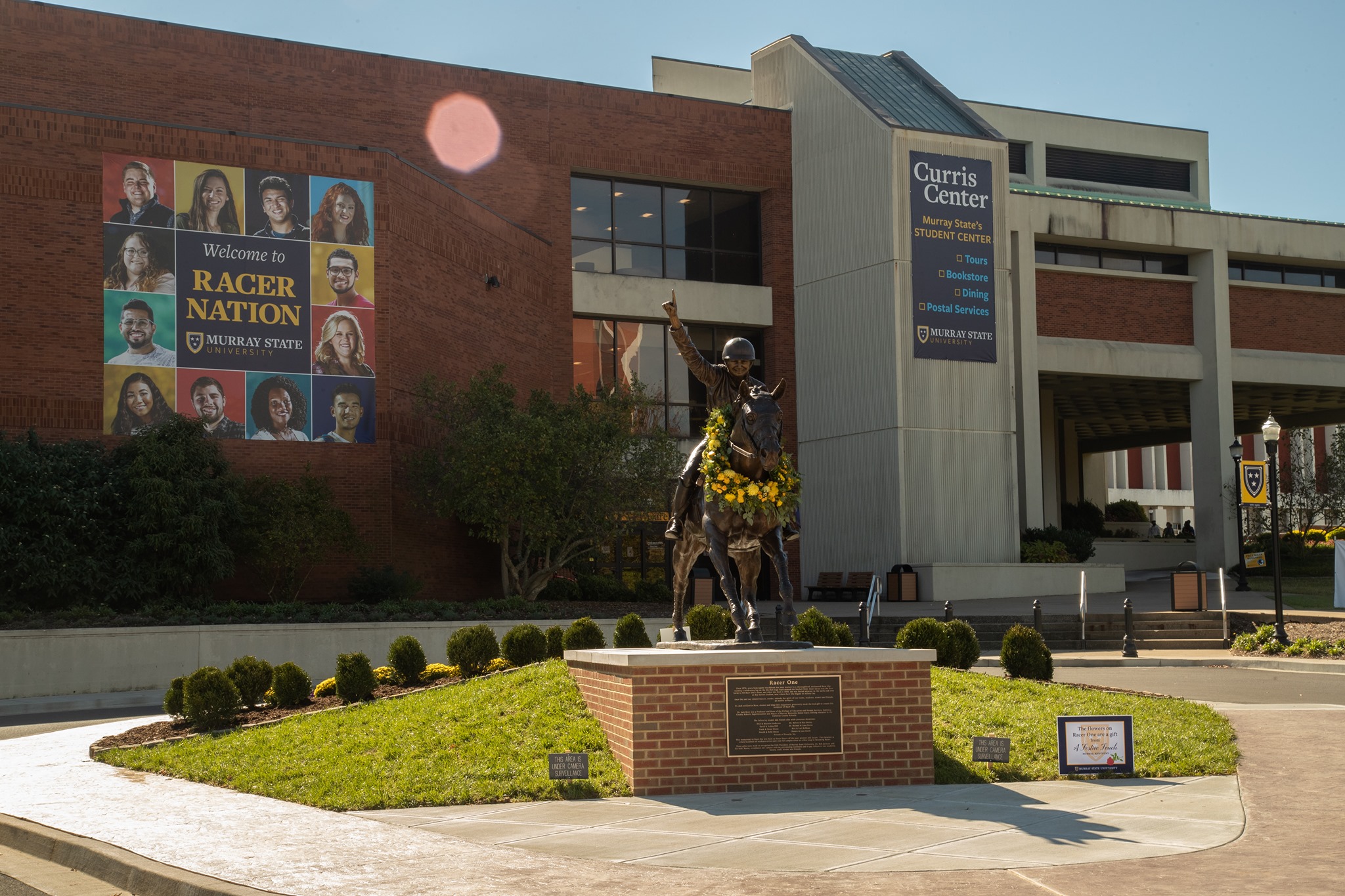 Murray State’s favorite thoroughbred, Racer One, is now permanently displayed on campus. The sculpture, which is 150% larger than life size, displays Racer One and jockey, and is located in front of the Curris Center off of Chestnut Street. The monument honors Racers of the past, present and future, and its location is where hundreds of students arrive each year for campus tours as a first step in becoming Racers.