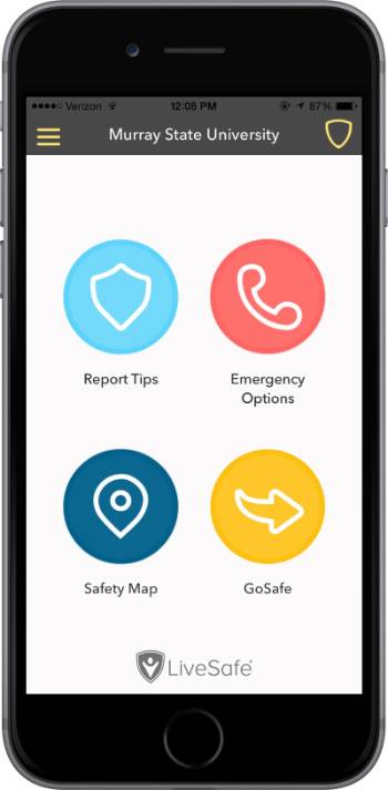 LiveSafe is a free mobile app made available by the Murray State Police Department. It's designed to prevent crime and enable better incident response. The app for smartphone users is connected to a cloud-based dashboard that is monitored within the Murray State dispatch center.