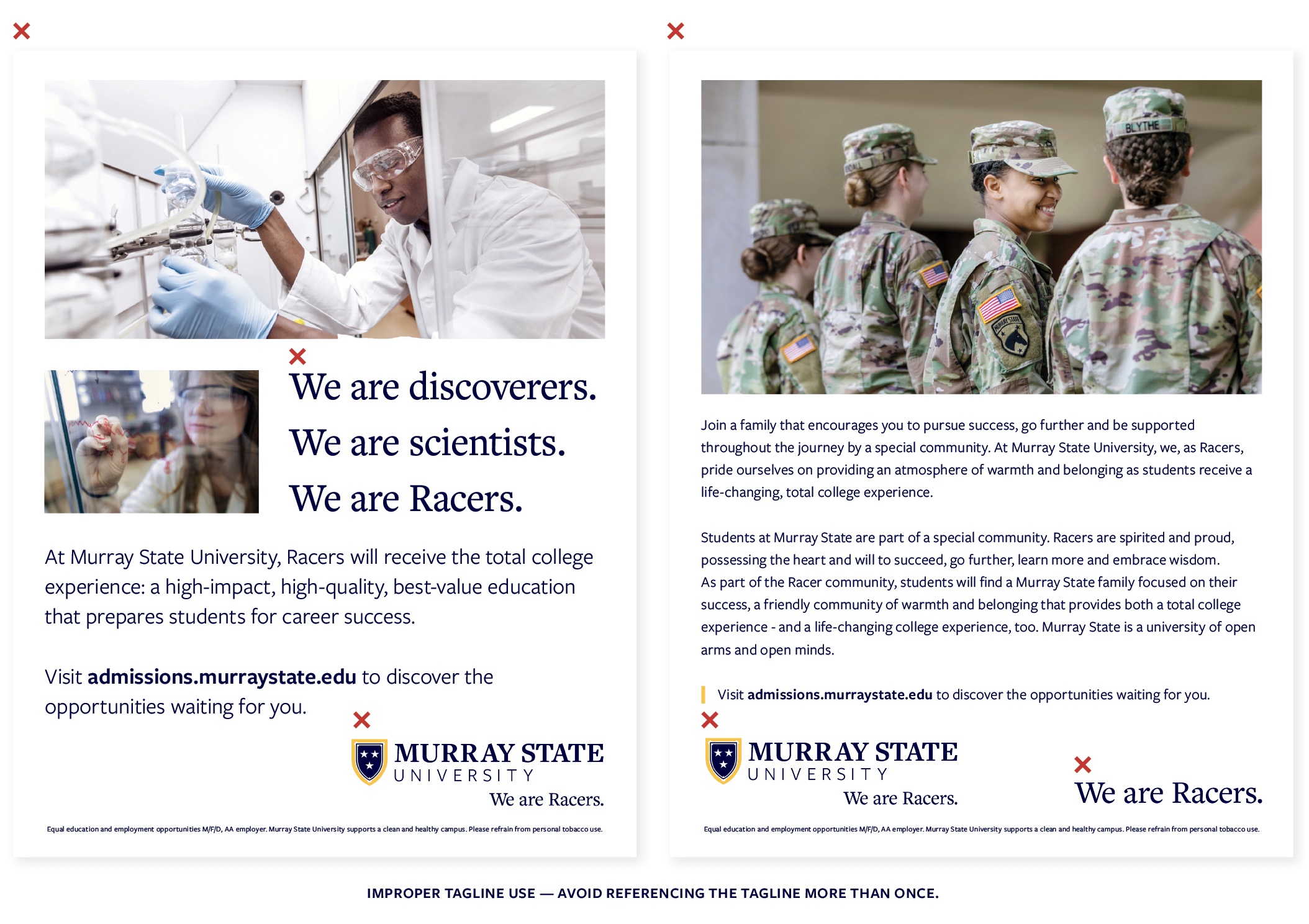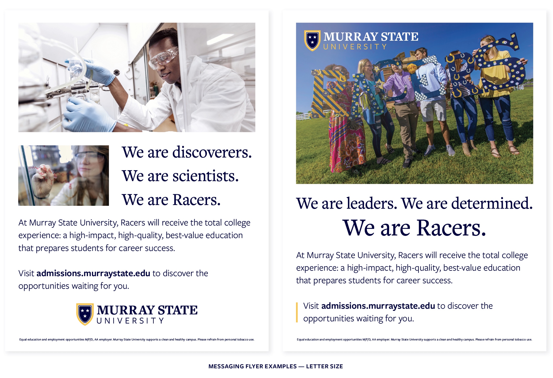 Any promotional or marketing material that represents any aspect of the University is required to have an equal opportunity statement. The shortened version is easiest to include and can be placed in the footer of the publication in a small font. The font should be no smaller than 6 points with enough contrast to be legible.