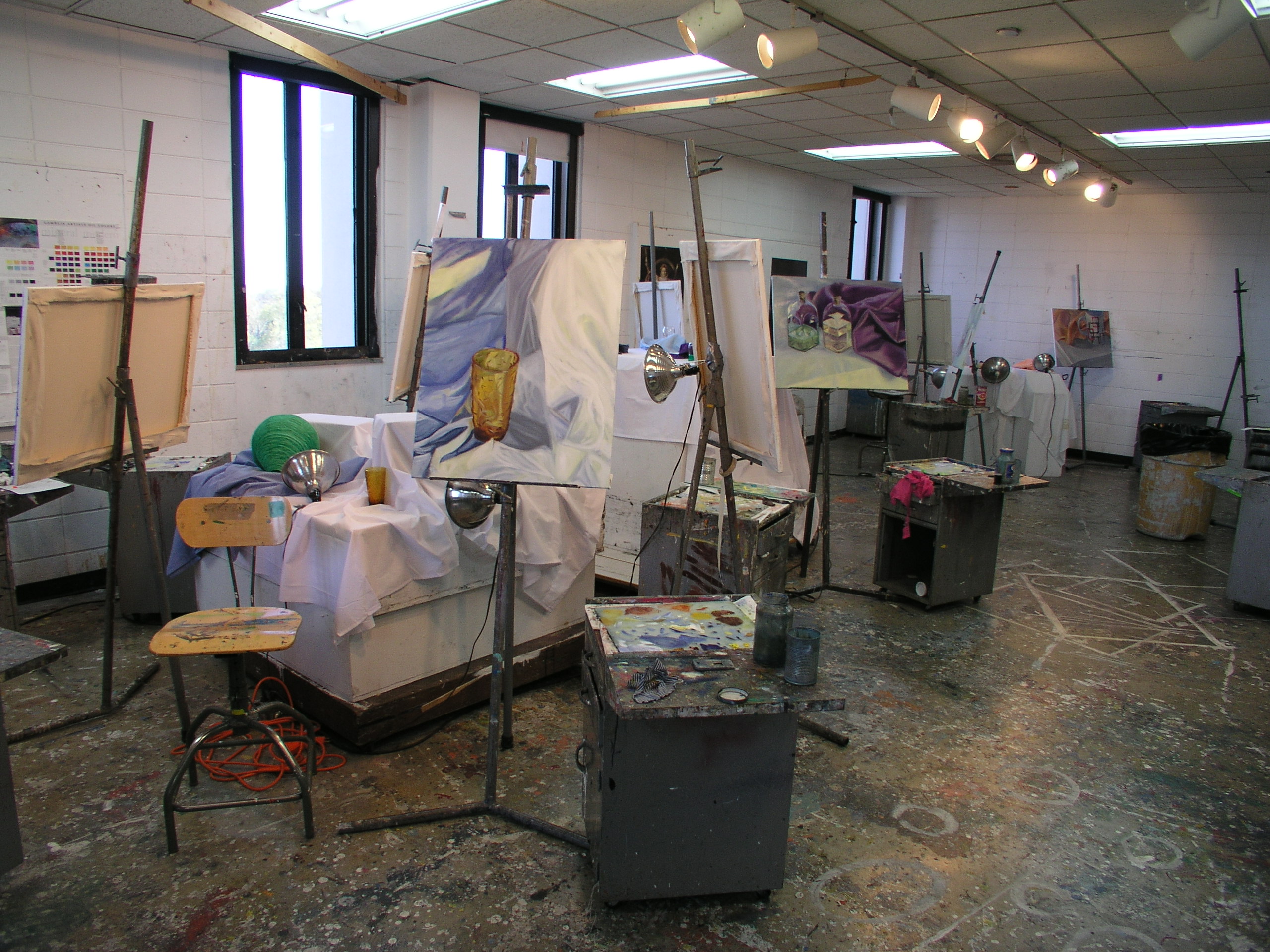 At the first level of painting, students learn how to handle the medium through such techniques as flat paint application, blending, impasto, glazing, scumbling and wet into wet. Students work further with compositional skills acquired in Drawing I and Two Dimensional Design to create images with interest and tension, as well as pleasing relationships of color, scale, texture, value and line. Students learn how to mix color, which means having a grasp of color theory and relationships. Students come to understand how color relates to space. Basic skills involved in rendering are covered: how to minutely observe surface detail and color and light to “paint what you see.”