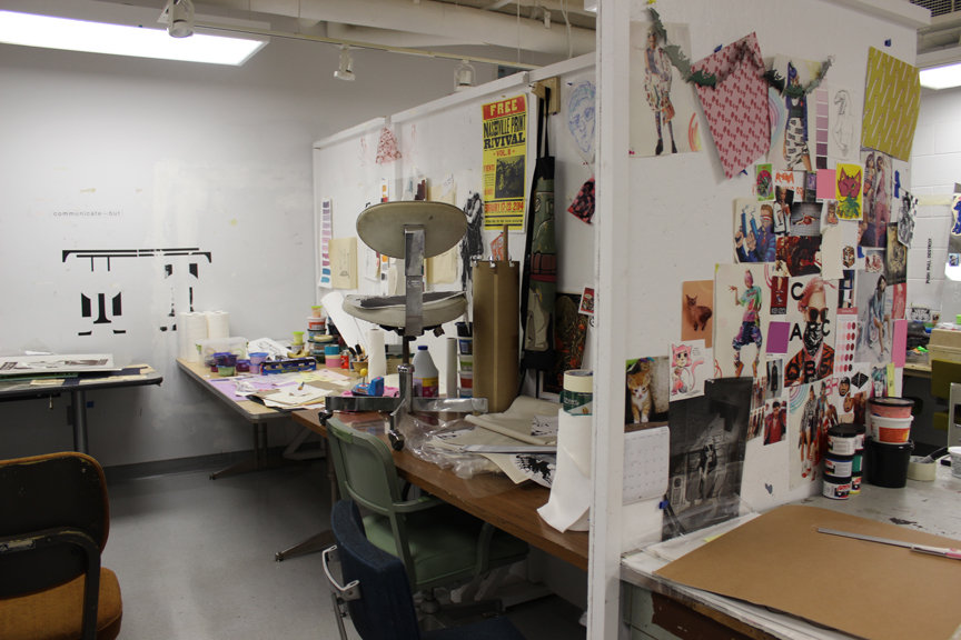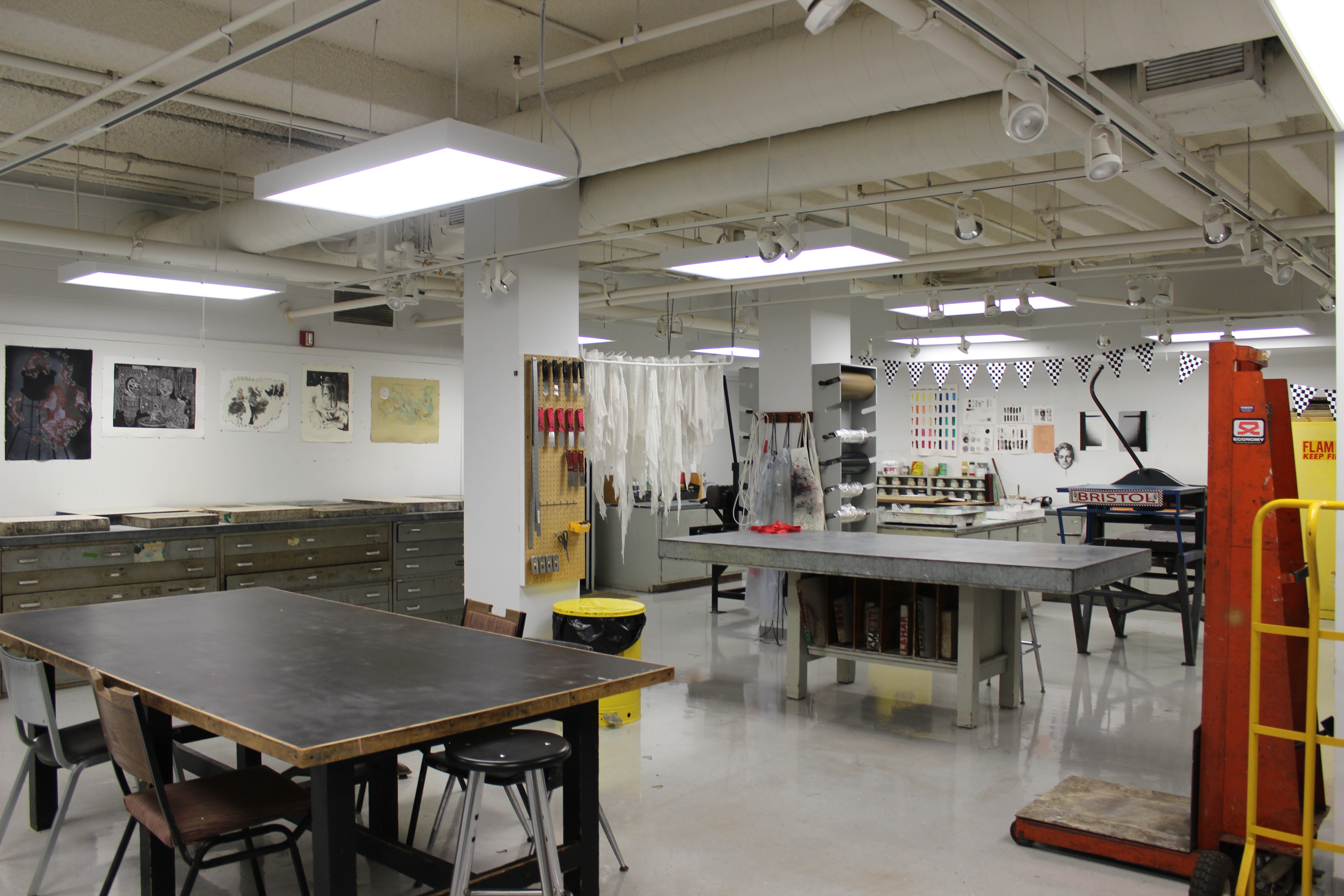 The printmaking studio has 3,621 square feet of studio space open 24 hours a day. Individual studio spaces for students with an emphasis in this area are also available.