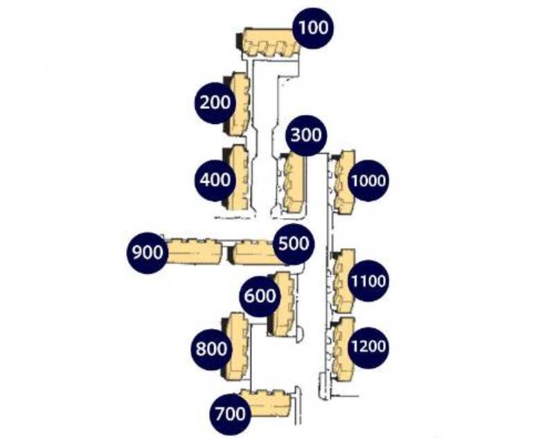 College Couts is set up in 12 Blocks of apartments. Each apartment block has 12 apartments, 6 on the ground floor and 6 on the second floor. The diagram on the blocks shown here is the view from campus. The 700 blocks is next to Hester Hall and the 1200 and the 1100 Block are next to the Wellness Center. The block are labeled in the middle section of each block. Below you will find the layout of the apartment styles and more information about College Courts.