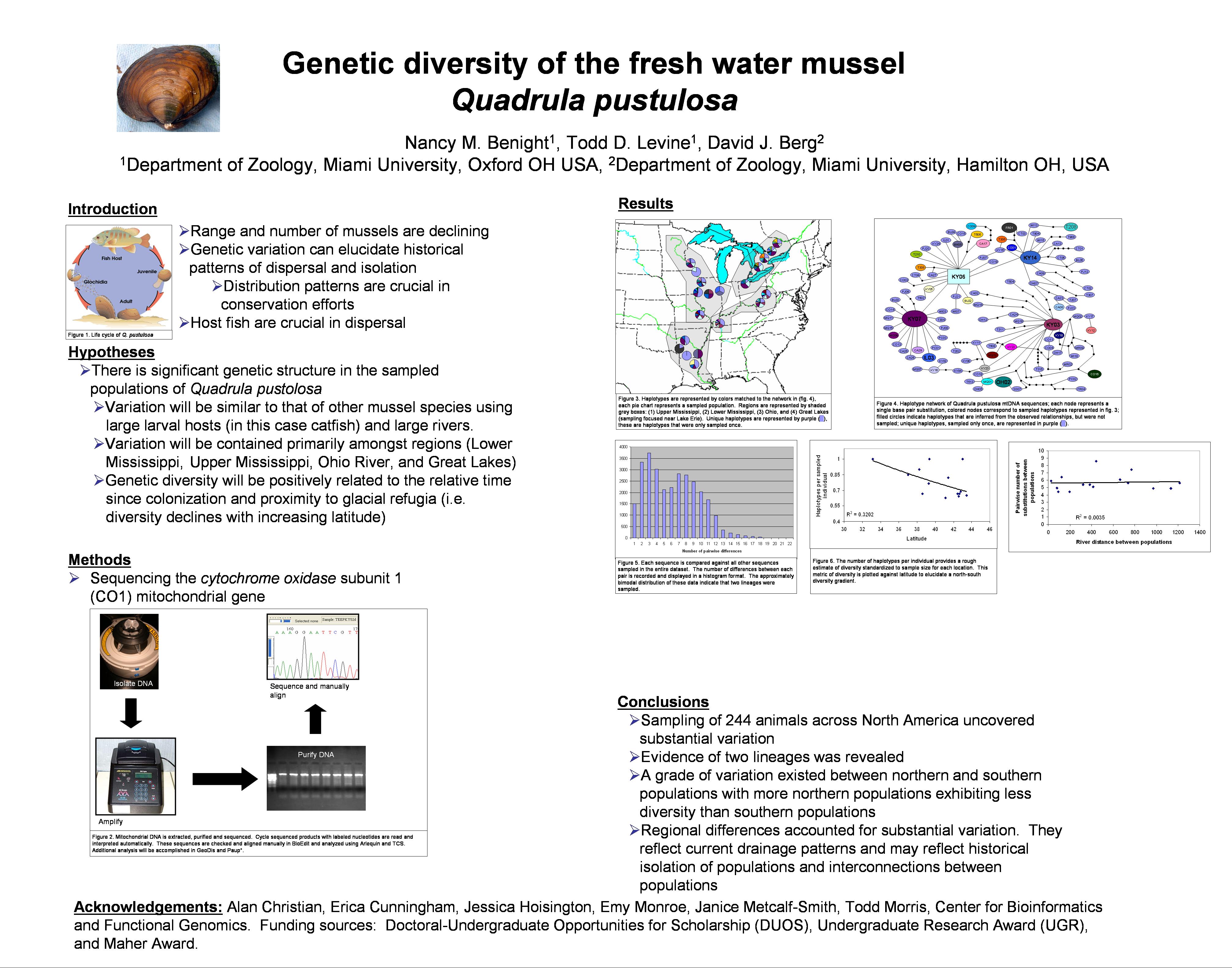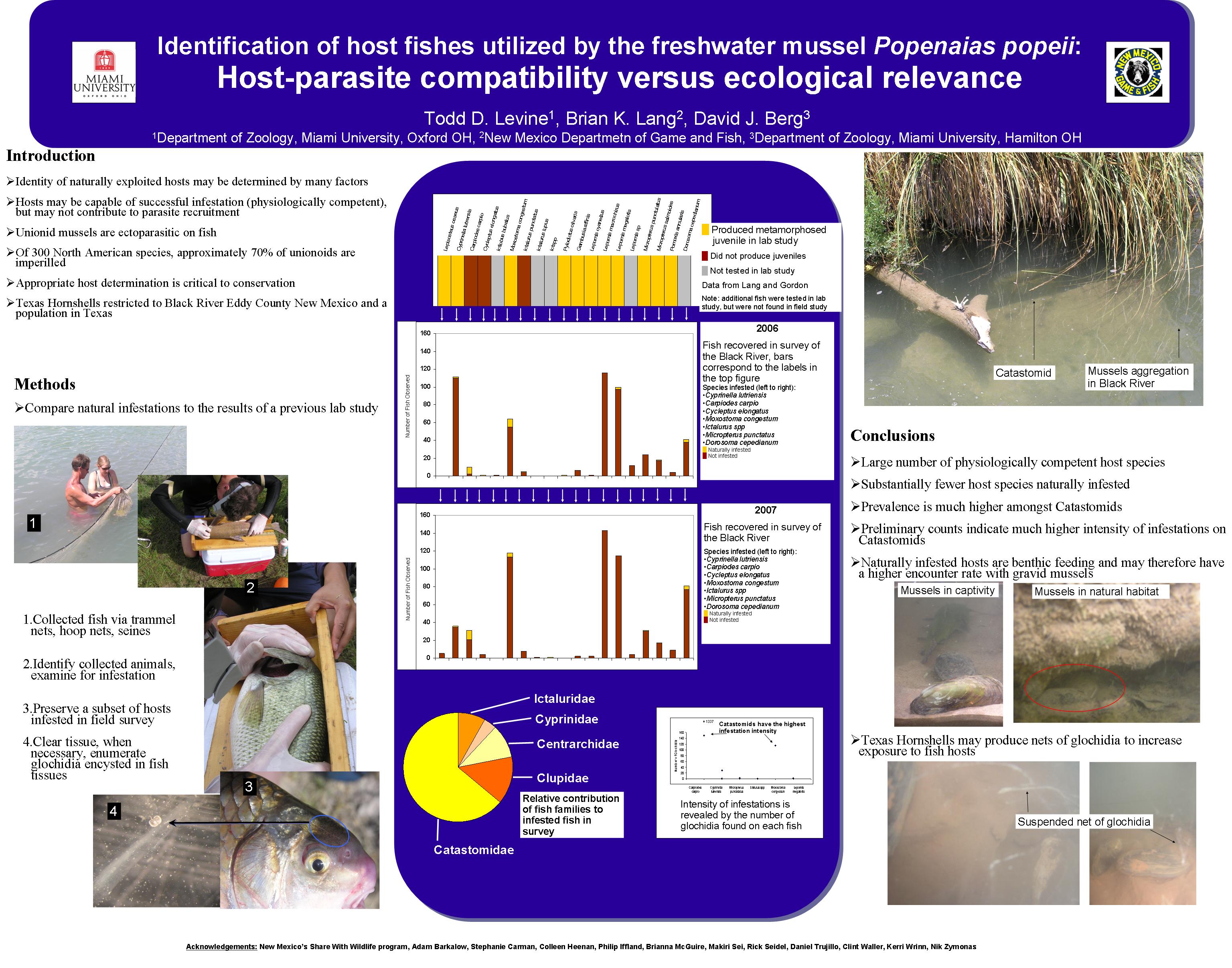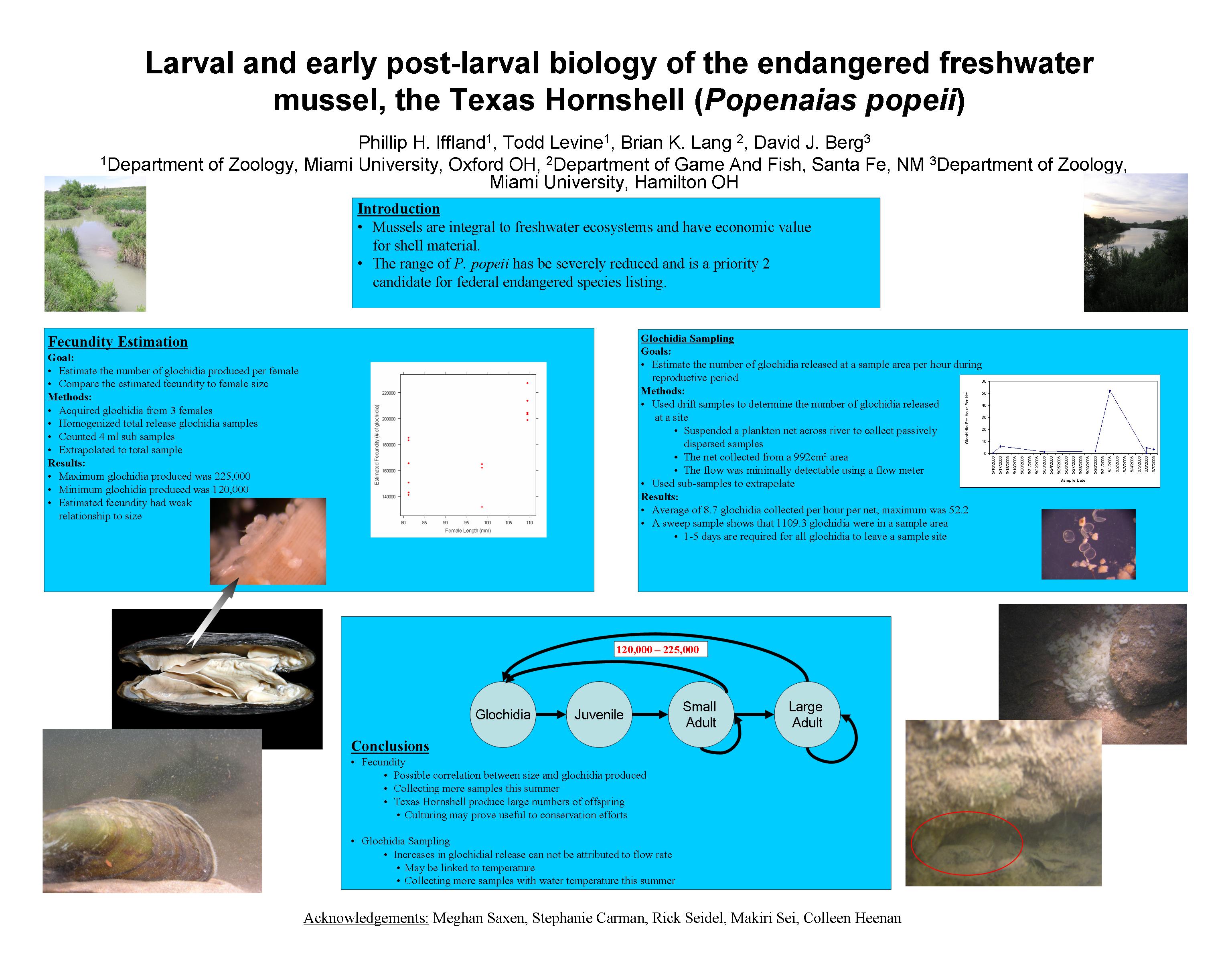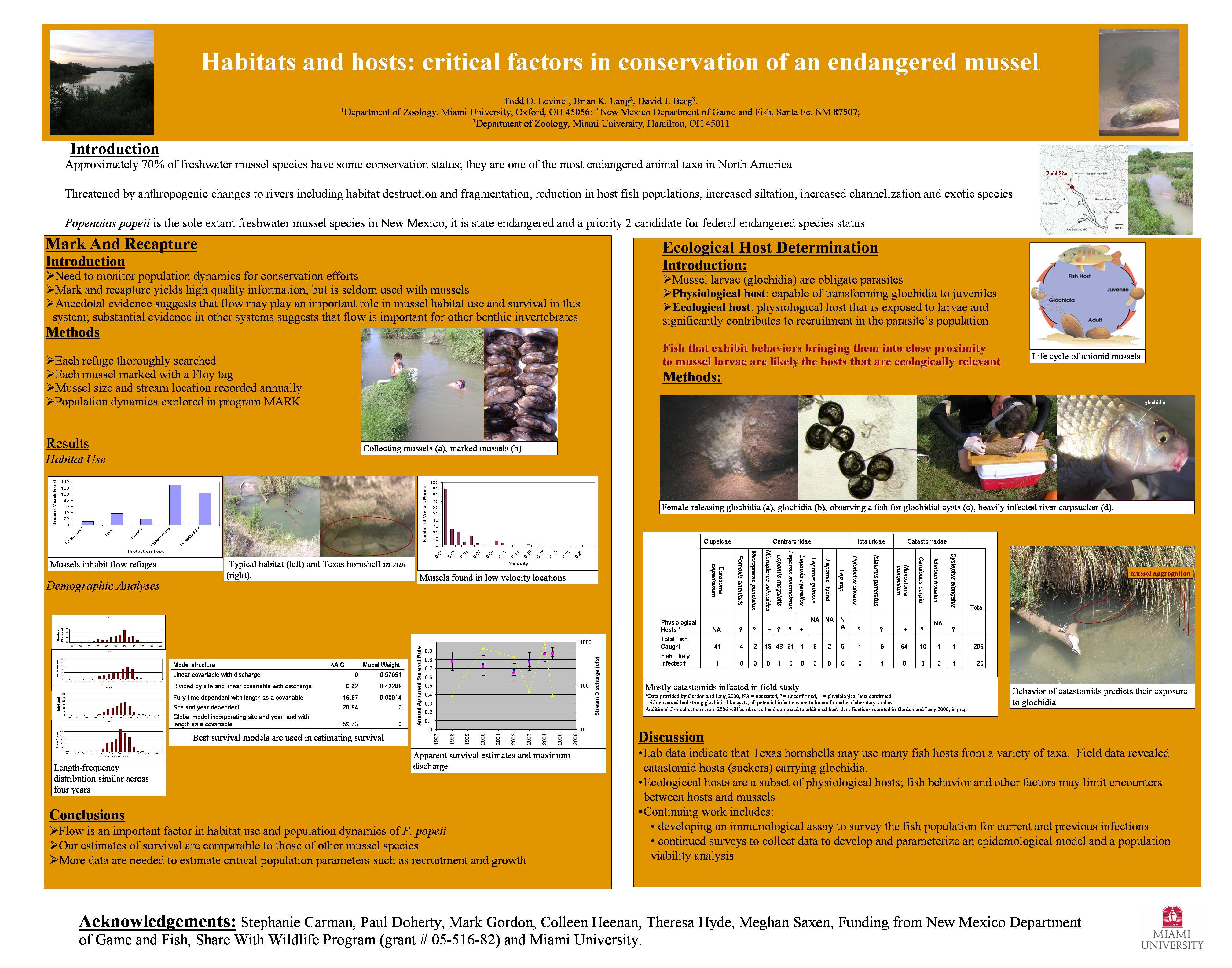 I have pursued an understanding of these interactions, some general methological themes have caught my attention and have enhanced my ability to understand these interactions. Of particular interest to me, has been the challenge of gathering data on difficult to sample organisms. Mussels fit squarely into this description; infecting fish as microscopic ectoparasites (although other terms may be used here), excysting from fish at less than a milimeter long and growing to macroscopic animals that may survive to ages of more than 100 years. Along these lines, I have participated in and/or led studies of long- term mark-and-[recapture datasets and population genetic studies to track the ecology and potential for evolution.